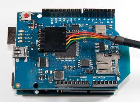 There is an onboard Mini-USB connector. This is not for programming an attached Arduino, it is for updating the AT32UC3 using the Atmel DFU protocol. The programming jumper adjacent to the power bus and analog inputs should be left unconnected for typical use. It is only used for DFU programming mode.